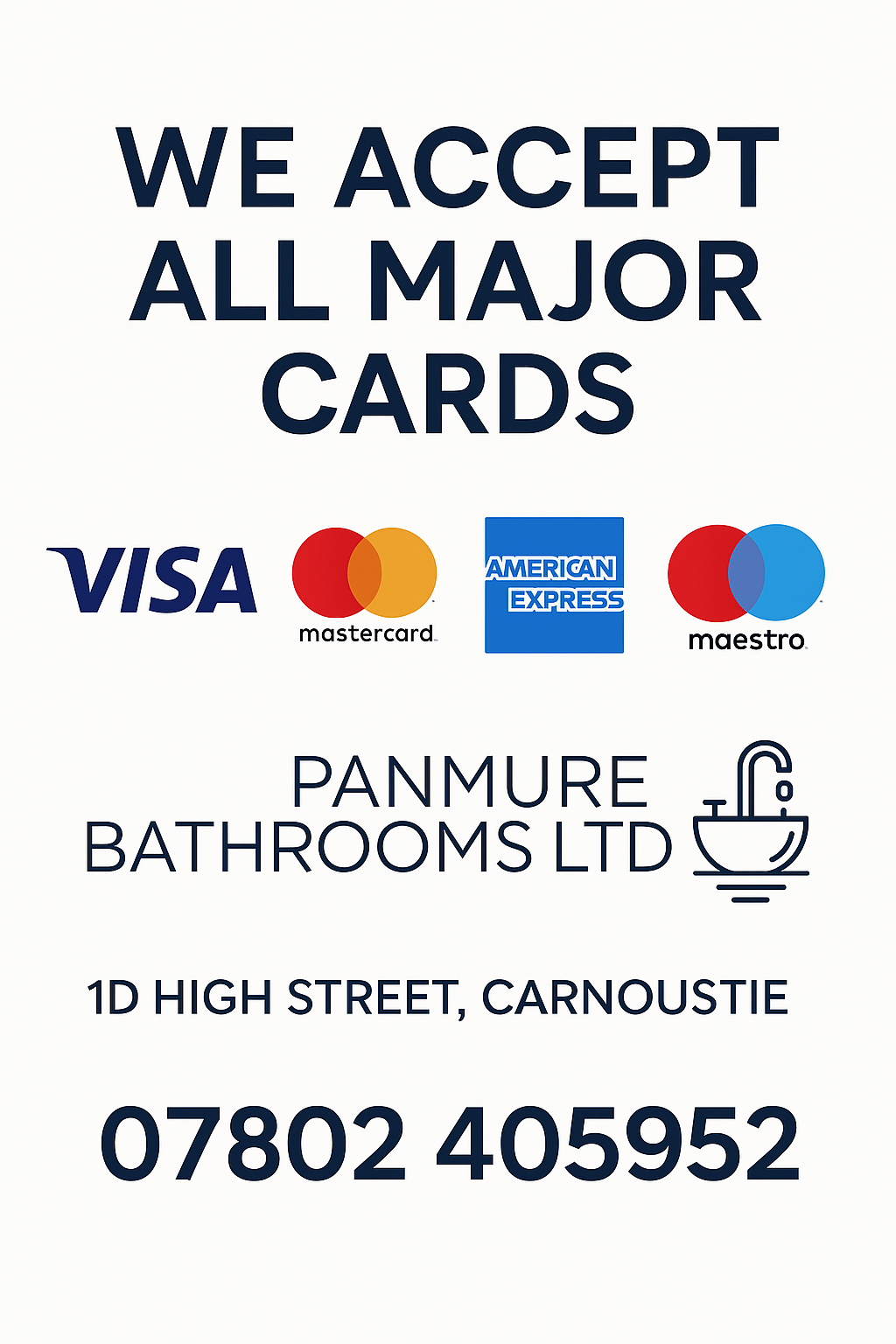 At Panmure Bathrooms Ltd, we make paying simple and convenient. We accept all major debit and credit cards, including contactless and mobile payments, giving you flexibility and peace of mind when settling your balance.
